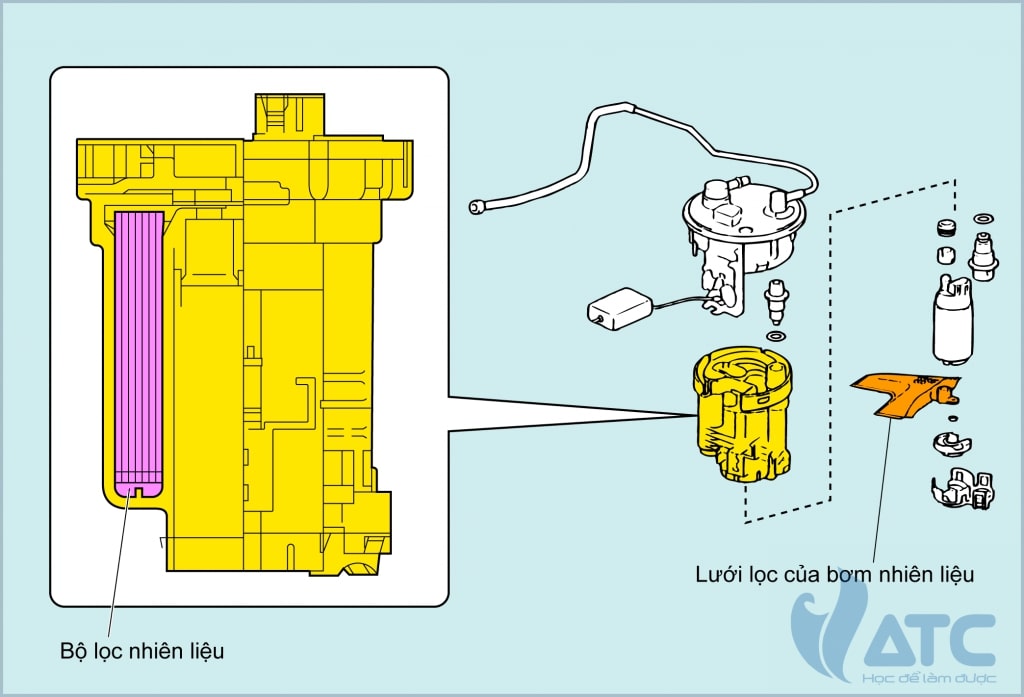 Bộ lọc nhiên liệu: Bộ lọc nhiên liệu khử bụi bẩn và các tạp chất trong nhiên liệu được bơm lên bởi bơm nhiên liệu.