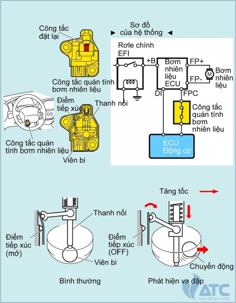 - Khi viên bi trong công tắc này dịch chuyển vì có va đập, công tắc này bị tách khỏi tiếp điểm để xoay nó về vị trí OFF và ngừng hoạt động của bơm nhiên liệu.