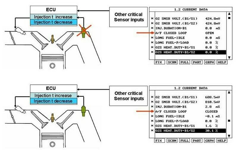 Thì ECM sẽ ở chế độ vòng lặp hở. Khi ở chế độ vòng lặp hở, ECU không sử dụng tín hiệu cảm biến oxy để hiệu chỉnh thời gian phun (xem hình có dấu X màu đỏ đè lên trên cảm biến oxy).