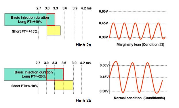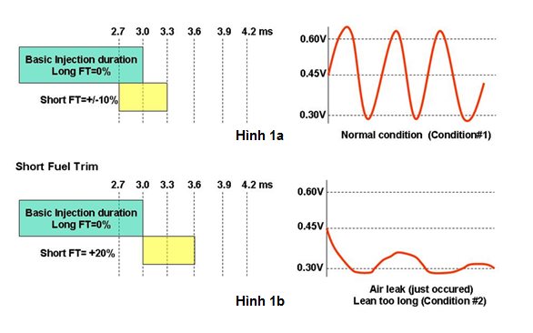 Lúc này, ECM điều khiển “Short Term Fuel Trim” sẽ cố gắng hiệu chỉnh để đạt tới tới giới hạn +20% mà không đưa cảm biến oxy chuyển mạch trở lại bình thường. ECM biết rằng, trong trường hợp này cần phải tăng thời gian phun cơ bản để đưa cảm biến oxy có thể trở lại phạm vi hoạt động bình thường (xem hình 1b và hình 2a).