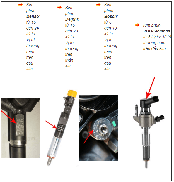 Mỗi loại động cơ khác nhau và mỗi loại kim phun khác nhau sẽ có số ký tự của mã kim và vị trí của mã kim phun khác nhau. Để xác định mã rất đơn giản chỉ cần tìm dãy ký tự từ 6 đến 30 ký tự thường được khắc trên thân kim hoặc trên đầu kim, đó chính là mã kim phun, hoặc có thể quét mã QR cũng sẽ tìm ra mã kim phun. Sau đây là một số loại kim phun phổ biến mà mình đã tổng hợp được.