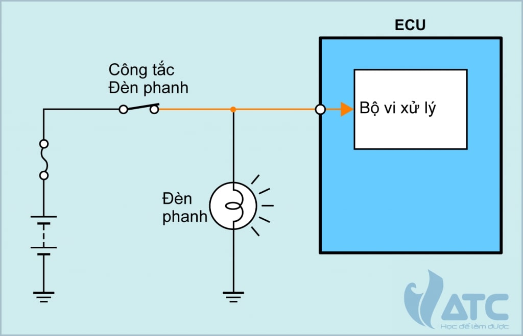 Hình minh họa thể hiện một mạch điện của đèn phanh, và khi công tắc bật ON, điện áp 12V của ắc quy được đặt vào cực ECU động cơ, và khi công tắc này bị ngắt OFF, điện áp sẽ là 0V.