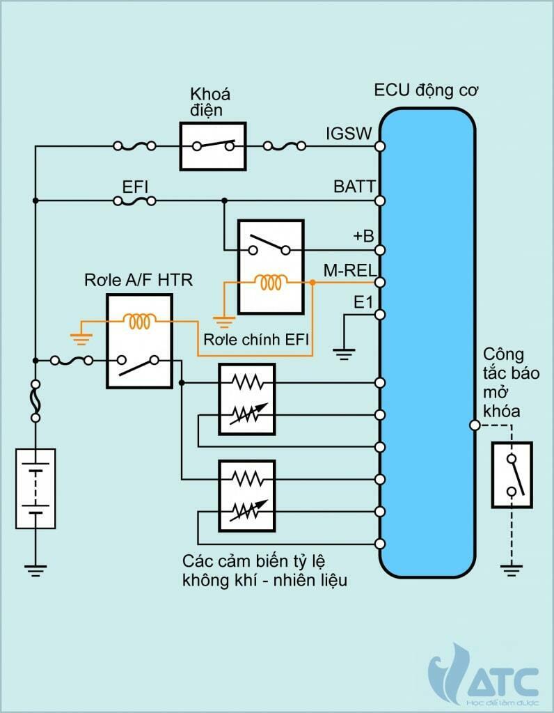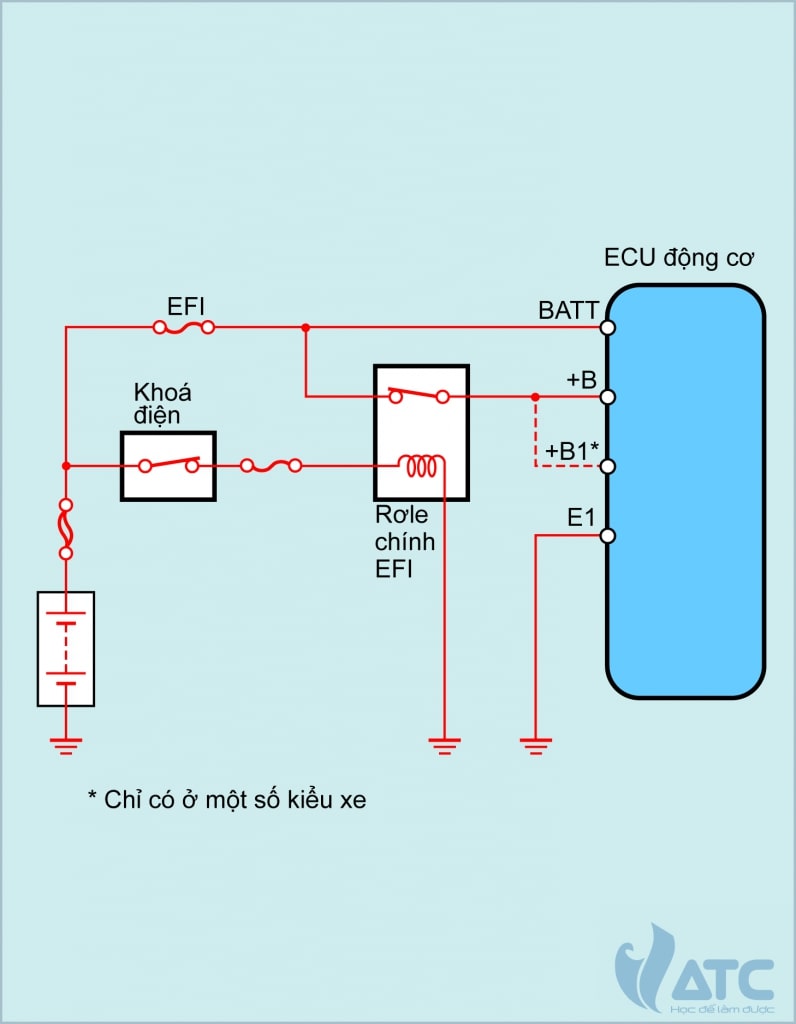 Mạch nguồn trong hình minh họa là loại trong đó hoạt động của rơle chính EFI được điều khiển bởi ECU động cơ.