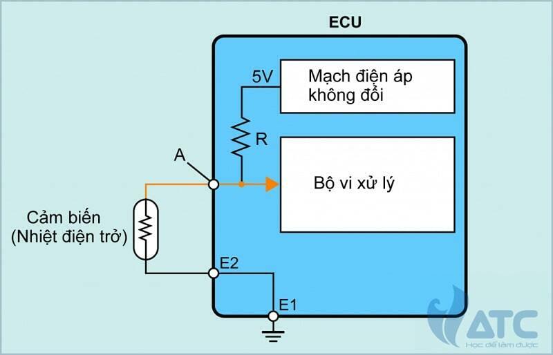 Như trình bày trong hình minh họa, điện áp được cấp vào nhiệt điện trở của cảm biến từ mạch điện áp không đổi (5V) trong ECU động cơ qua điện trở R. Các đặc tính của nhiệt điện trở này được ECU động cơ sử dụng để phát hiện nhiệt độ bằng sự thay đổi điện áp tại điểm A trong hình minh họa.