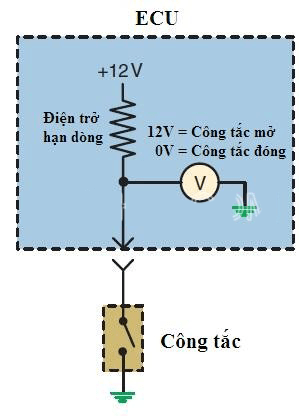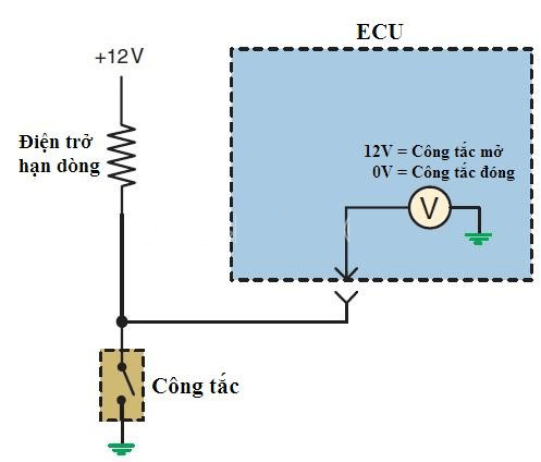 Khi hoạt động, ECU sẽ giám sát hai trạng thái của công tắc điện bằng cách đo các điện áp đầu vào của chúng. Có hai kiểu mạch cảm nhận điện áp chính được sử dụng đó là kiểu mạch kéo lên và kiểu mạch kéo xuống. Các bạn có thể hiểu: mạch “kéo xuống” công tắc sẽ đóng về mass và kiểu mạch “kéo lên” sẽ đóng về nguồn dương.