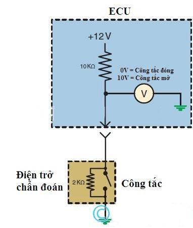 Vậy làm cách nào để ECU có thể chẩn đoán được tình trạng hư hỏng của mạch công tắc với hai loại mạch trên, khi chỉ có hai trạng thái của công tắc và ECU chỉ có hai mức điện áp để nhận biết?