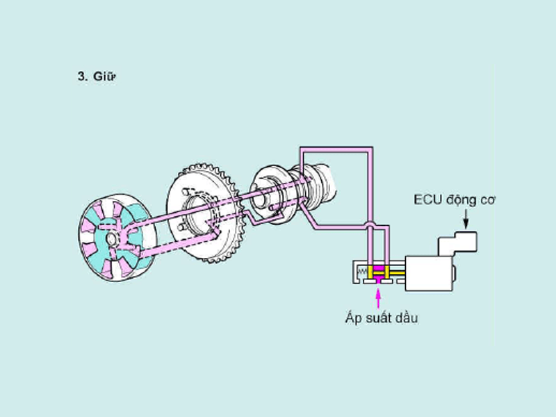 - Giữ: ECU động cơ tính toán góc phối khí chuẩn theo tình trạng vận hành. Sau khi đặt thời điểm phối khí chuẩn, van điều khiển dầu phối khí trục cam duy trì đường dầu đóng như được chỉ ra trên hình vẽ để giữ thời điểm phối khí hiện tại.