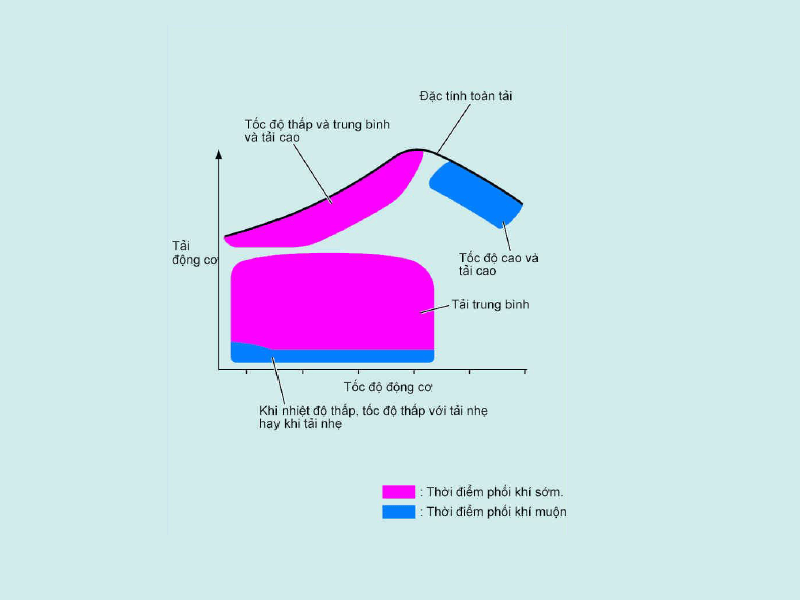 - Khi nhiệt độ thấp, khi tốc độ thấp ở tải nhẹ hay khi tải nhẹ: Thời điểm phối khí trục cam nạp được làm trễ lại và độ trùng lặp xupap giảm đi để giảm khí xả chạy ngược lại phía nạp. Điều này làm ổn định chế độ không tải và cải thiện tính kinh tế nhiên liệu và tính khởi động.