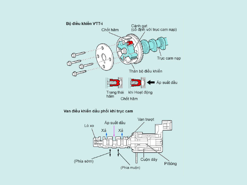 Bao gồm bộ điều khiển VVT-i dùng để xoay trục cam nạp, áp suất dầu dùng làm lực xoay cho bộ điều khiển VVT-i và van điều khiển dầu phối khí trục cam để điều khiển đường đi của dầu.