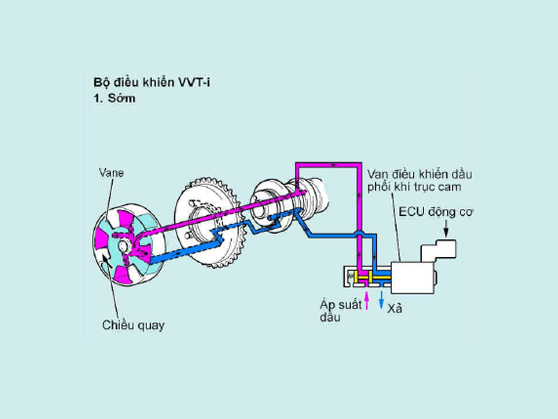 - Làm sớm thời điểm phối khí: Khi van điều khiển dầu phối khí trục cam được đặt ở vị trí như trên hình vẽ bằng ECU động cơ, áp suất dầu tác động lên khoang cánh gạt phía làm sớm thời điểm phối khí để quay trục cam nạp về chiều làm sớm thời điểm phối khí.