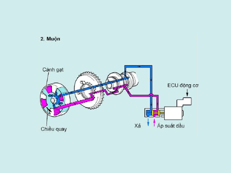 - Làm muộn thời điểm phối khí: Khi ECU đặt van điều khiển thời điểm phối khí trục cam ở vị trí như chỉ ra trong hình vẽ, áp suất dầu tác dụng lên khoang cánh gạt phía làm muộn thời điểm phối khí để làm quay trục cam nạp theo chiều quay làm muộn thời điểm phối khí.