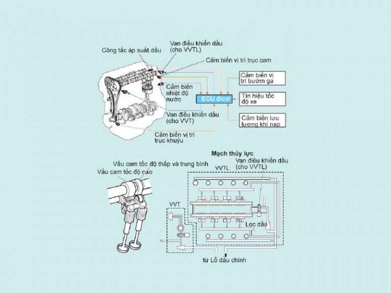 Cơ cấu chuyển vấu cam, ECU động cơ chuyển giữa 2 vấu cam bằng van điều khiển dầu VVTL dựa trên các tín hiệu từ cảm biến nhiệt động nước làm mát và cảm biến vị trí trục khuỷu.