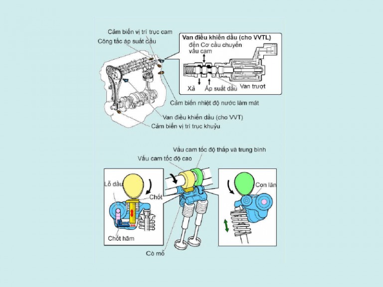 Van điều khiển dầu cho VVTL điều khiển áp suất dầu cấp đến phía cam tốc độ cao của cơ cấu chuyển vấu cam bằng thao tác điều khiển vị trí van ống do ECU động cơ thực hiện,