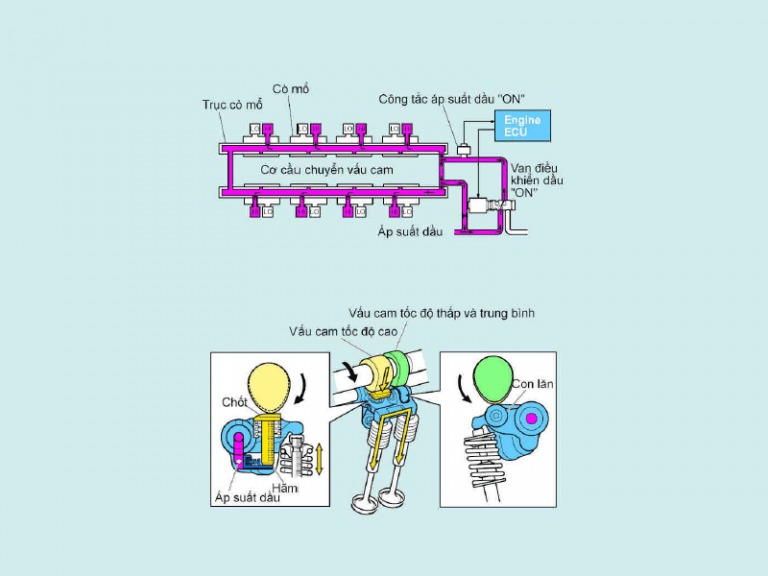 Để thay đổi hành trình xupap, trục cam có 2 loại vấu cam, vấu cam tốc độ thấp và vấu cam tốc độ cao cho mỗi xylanh.